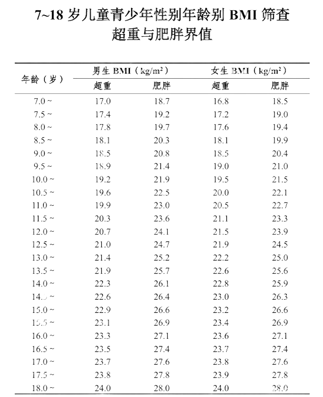 7~18岁儿童青少年以性别年龄别BMI作为筛查超重肥胖标准,家长可以借助对照表来帮孩子初步判断是否超重或肥胖。